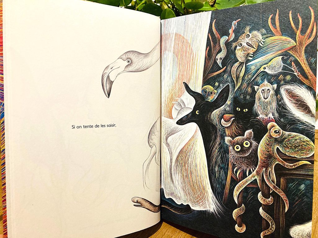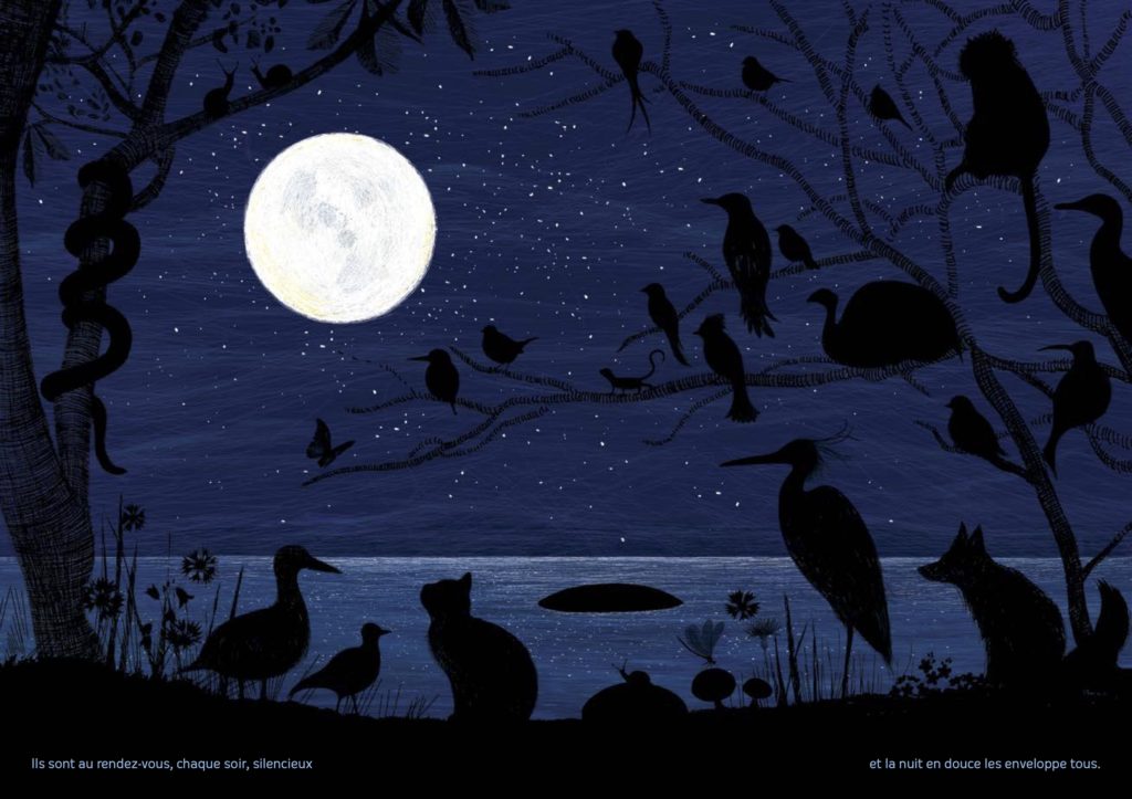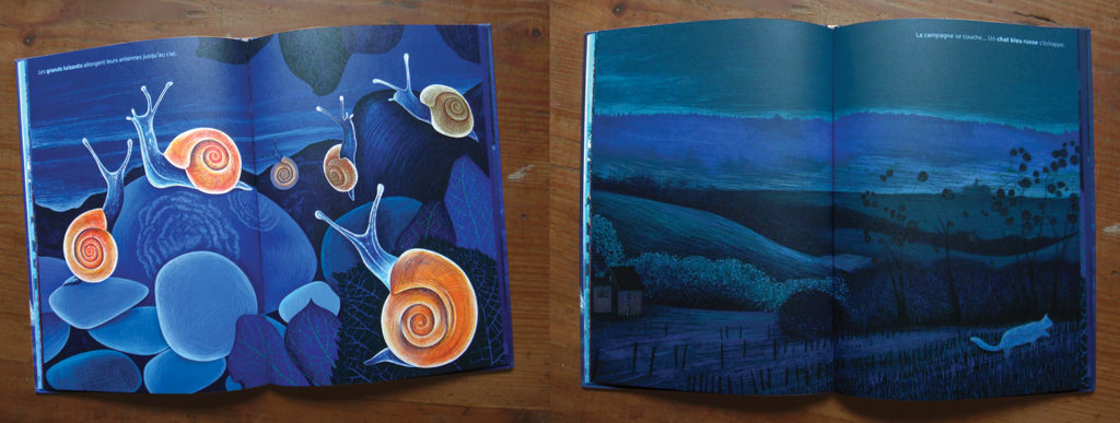 Elle a choisi d’inscrire le récit dans ce moment si particulier de transition où le jour baisse tandis que la nuit monte. L’idée était de rendre palpable les variations de la lumière et son nuancier de bleus. Des animaux bleus se sont invités : les « grands luisants » qui sont des escargots. Et puis des bêtes fictionnelles parce qu’on est dans le rêve éveillé. Des paysages. Et enfin la lune, magique.