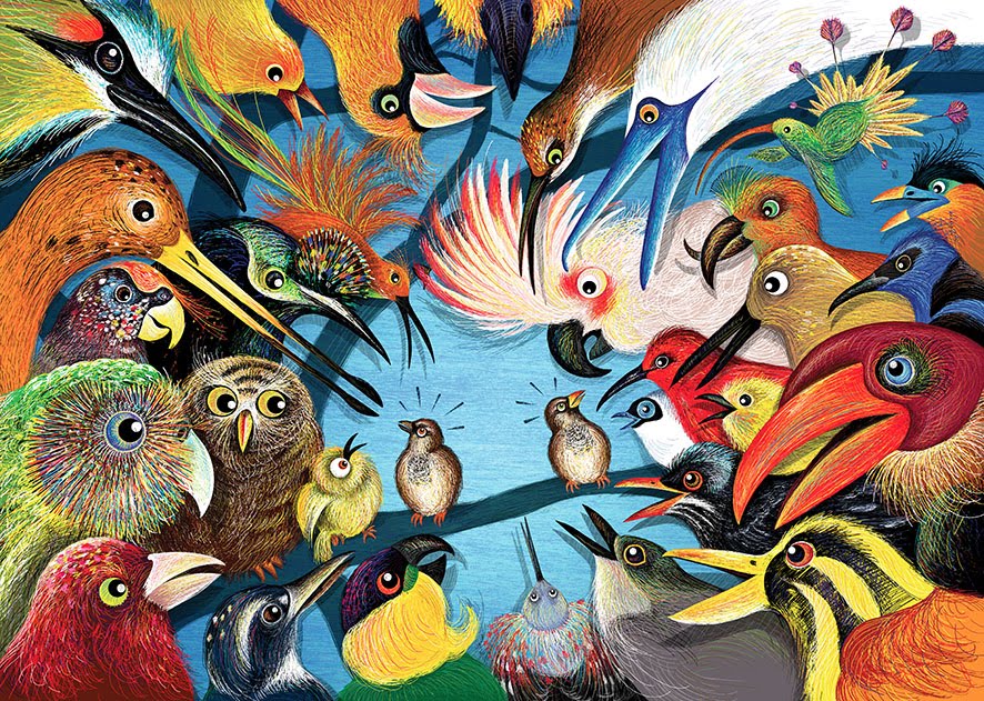 « naturalistes », tantôt des oiseaux complètement stylisés. Elle a animé la balade en faisant se déplacer le chat, au grand plaisir des enfants qui le suivent dans ses détours AU LIEU DE s’intéresser aux sujets principaux. Cet album « participatif » fait beaucoup parler, échanger et sourire.