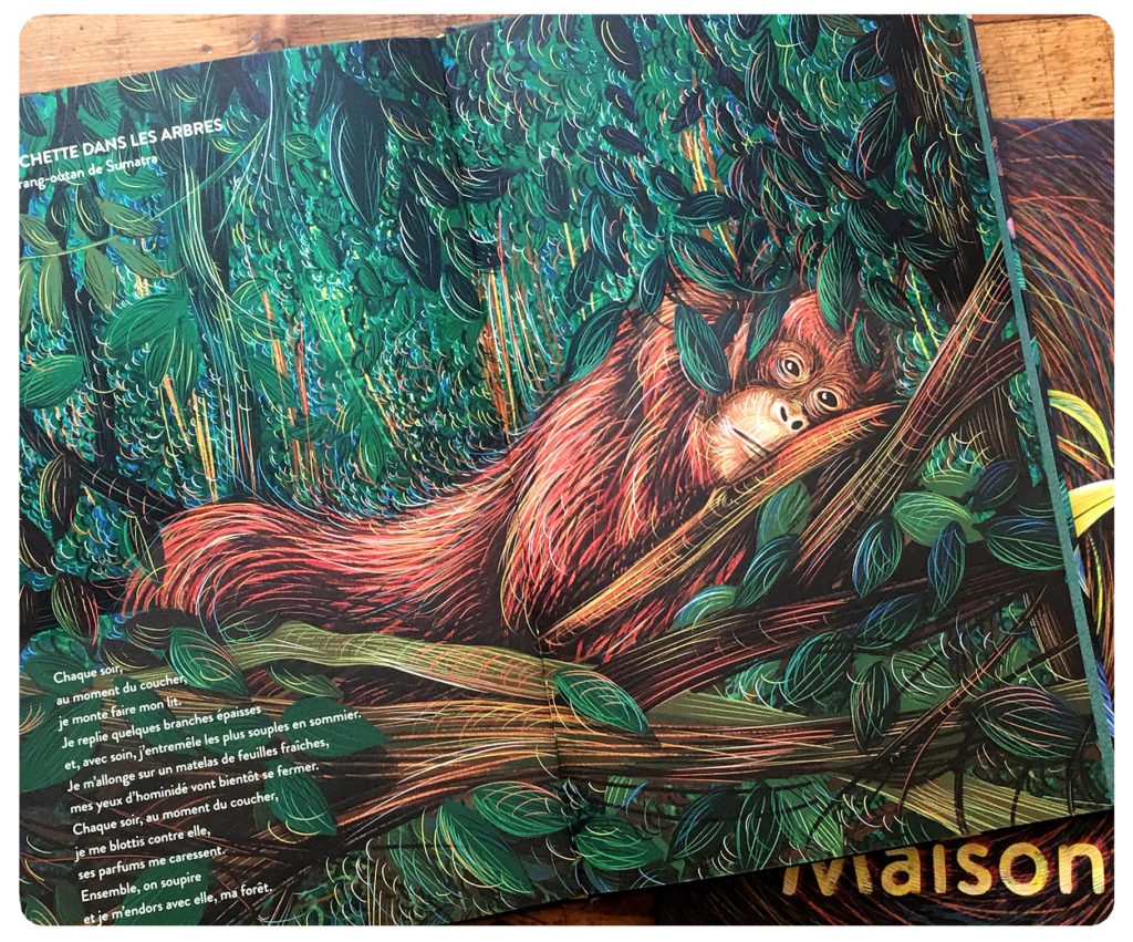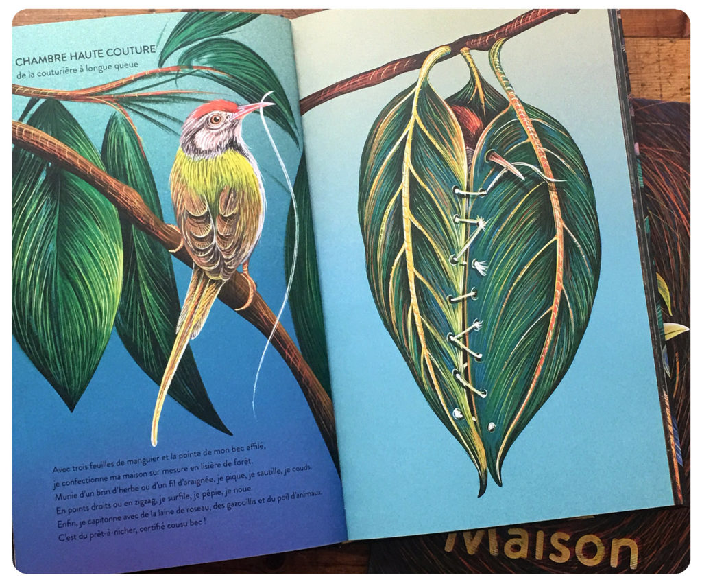 Dans ce livre écrit à la première personne, elle s’est imaginée dans les projets de 27 animaux qui se construisent des habitats étonnants : un orang-outan, qui se refait un lit de feuilles chaque soir, une mésange couturière qui capitonne son nid douillet, des grenouilles qui secrètent et font monter en neige une écume qui leur sert de cachette secrète, un oiseau-jardinier satiné qui décore de fleurs bleues sa tonnelle, une araignée aquatique qui loge dans une bulle d’air immergée, etc.