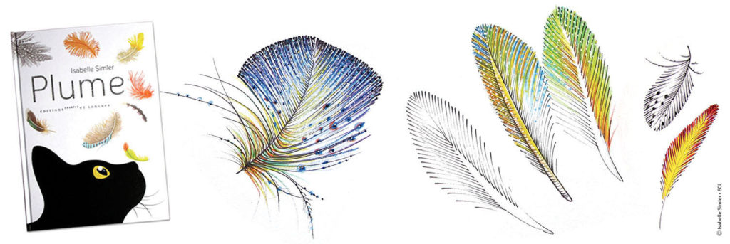 Né de l’idée très simple de dessiner des plumes, l’album s’enrichit comme par hasard d’un adorable chat, puis d’oiseaux, et il devient un imagier dans lequel on se promène pour le simple plaisir de la visite. Isabelle a voulu s’amuser à y varier les styles, tantôt dessinant des plumes très